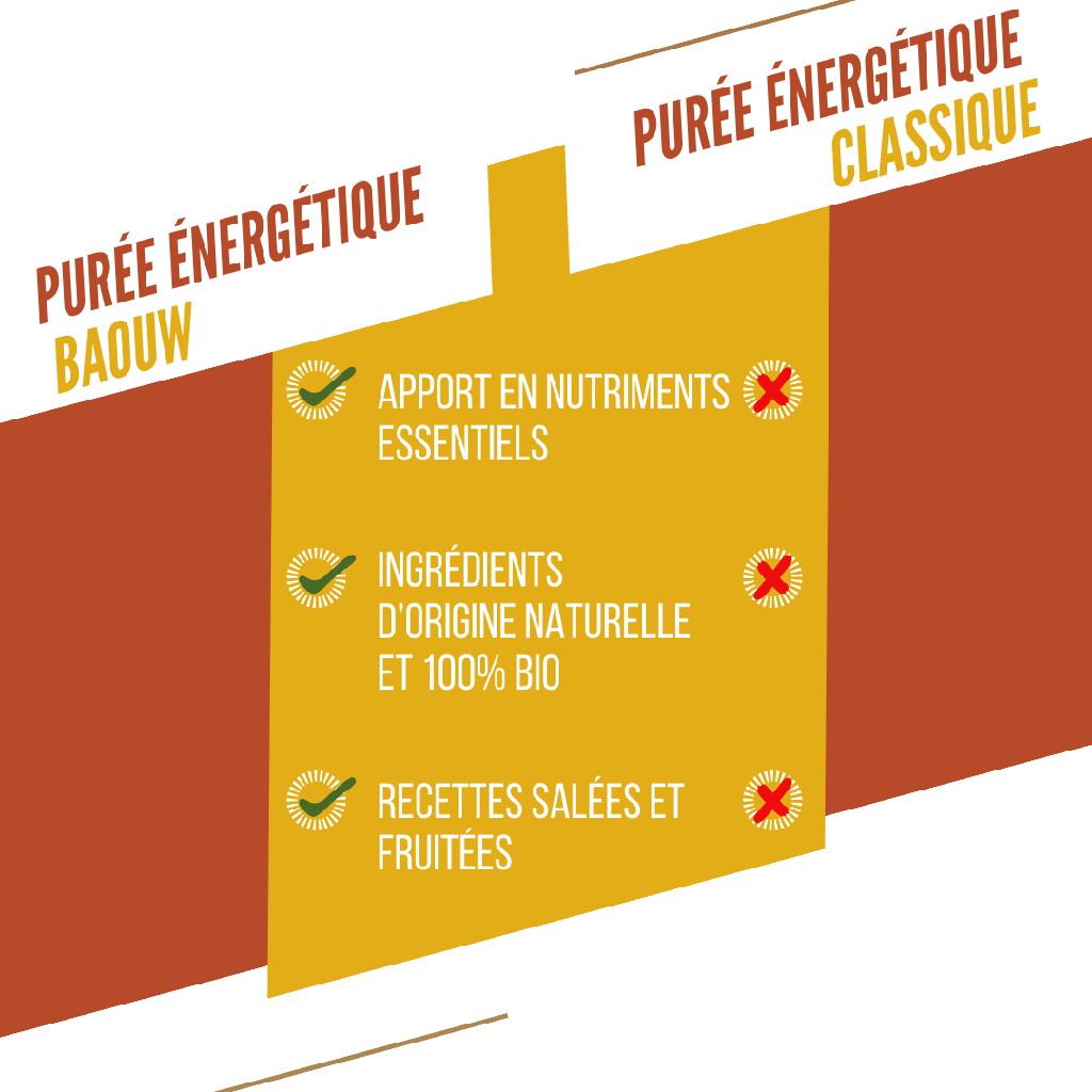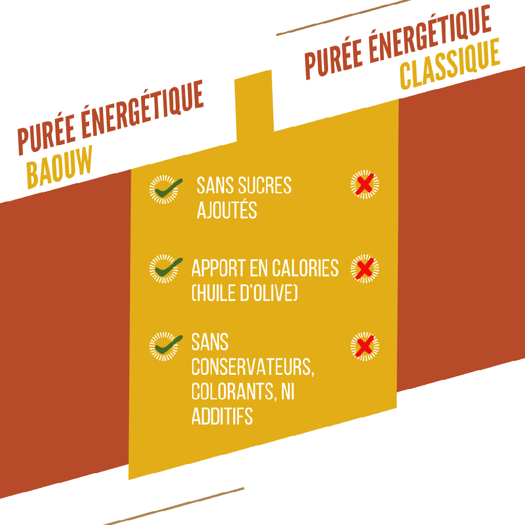 Konzipiert für den Sport, die BAOUW Energetisches Püree liefert die notwendigen Mineralien mit seiner Textur, die sich besonders während des Sports wie von selbst verteilt. Dank des Rezepts eines Küchenchefs mit zwei Michelin-Sternen bietet es einen milden und subtilen Geschmack. Es enthält keinen Zuckerzusatz, sondern nur den Zucker von Bio-Früchten!