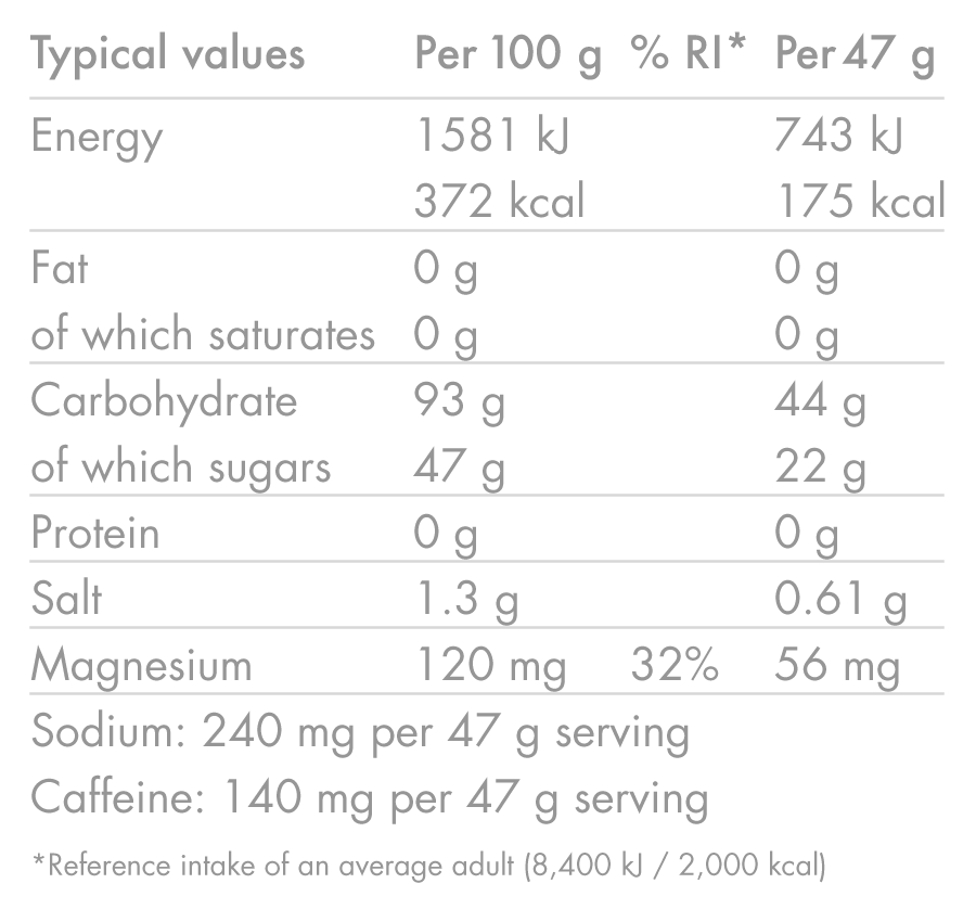 Dieser einzelne Beutel aus der CAFFEINE HIT kombiniert eine Dosis hohen Koffeingehalt (140 mg) mit schnell verwertbaren Kohlenhydraten und ElektrolyteSie können die körperliche und geistige Ausdauer bei den anspruchsvollsten Anstrengungen unterstützen.