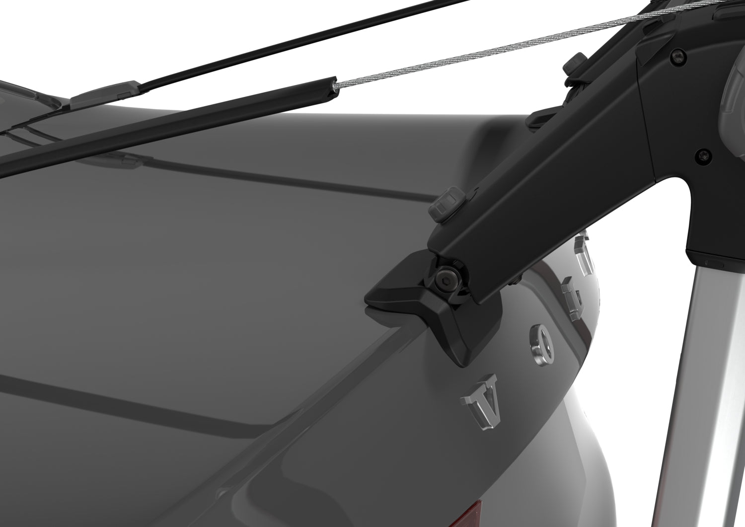 Die Montage erfolgt mit einem doppelten Hakensystem und robusten Stahlseilen, die an allen Kontaktstellen durch Gummibeschichtungen geschützt sind und eine sichere und stabile Befestigung des Fahrradträgers am Fahrzeug gewährleisten.