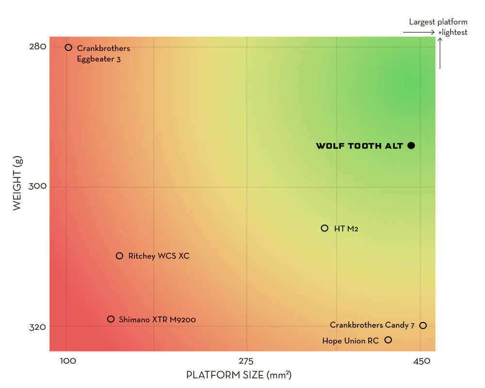 Une surface de plateforme plus grande que la concurrence à 345 mm² (comparé au Shimano XTR 9200 à 144 mm², au Hope RC à 420 mm² et au HT M2 à 357 mm²)