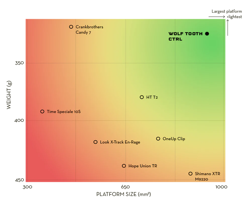 Surface de plateforme plus grande que la concurrence avec 941 mm² (comparé à la Shimano XTR 9220 à 883 mm² et à la Hope Trail à 645 mm²)