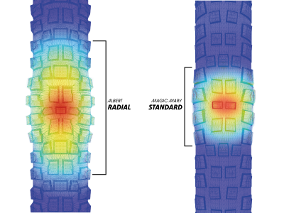 Schwalbe überdenkt die Struktur von Mountainbike-Reifen: Statt der klassischen Diagonalverwebung werden die Fäden in einem stumpferen Winkel Dadurch kann sich der Reifen punktueller verformen. Dadurch folgt er Unebenheiten viel besser als ein Reifen mit Diagonalkarkasse und behält immer den Kontakt zum Boden. Das Ergebnis: mehr Grip, mehr Komfort und mehr Sicherheit im Gelände. Außerdem vergrößert sich die Kontaktfläche bei gleichem Reifendruck um etwa 30%.