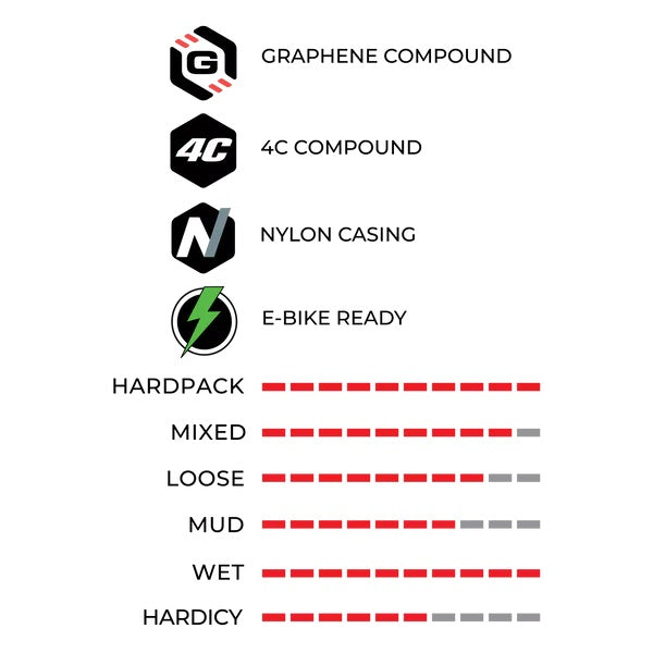Das 4C-Profil besteht aus vier Graphen-Zonen, die eine höhere Widerstandsfähigkeit und eine unvergleichliche Traktion auf technischen Strecken ermöglichen. Das E-Agarro ist außerdem um eine Karkasse herum konstruiert Trail TNT mit 120 TPI, die eine hohe Leistung und Widerstandsfähigkeit gegen Risse und Durchstiche garantiert.